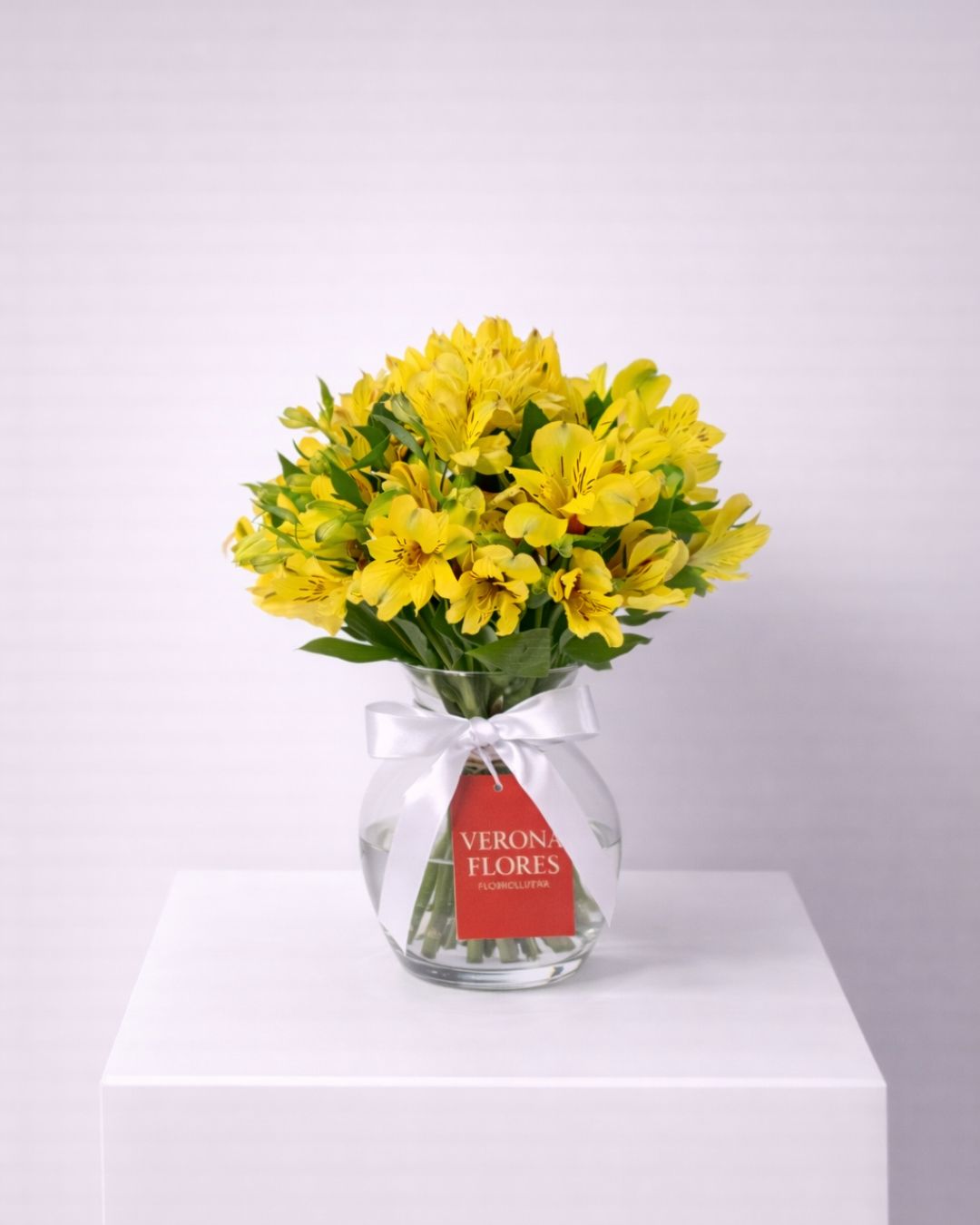 Arranjo alegre e delicado composto por astromélias amarelas, tango e folhagens verdes, acomodadas em vaso de vidro com acabamento em laço branco. Uma composição leve e iluminada, perfeita para transmitir felicidade, energia positiva e boas vibrações em qualquer ambiente.