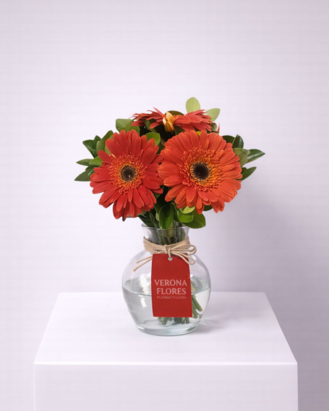 Arranjo alegre e vibrante composto por gérberas na cor laranja, harmonizadas com folhagens verdes e acomodadas em vaso de vidro com acabamento rústico. Um arranjo cheio de energia e calor, ideal para presentear, iluminar ambientes e transmitir alegria em qualquer ocasião.