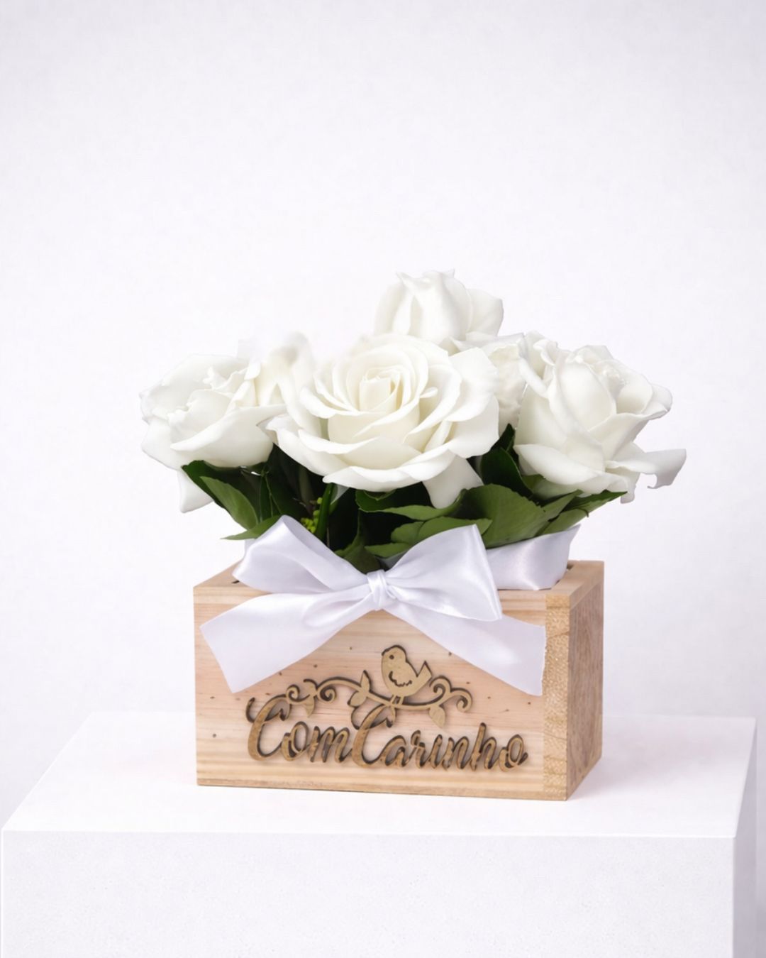 O Encanto Branco é composto por delicadas rosas brancas, criando uma apresentação sofisticada e atemporal. Ideal para momentos especiais que pedem delicadeza, respeito ou um gesto cheio de significado.