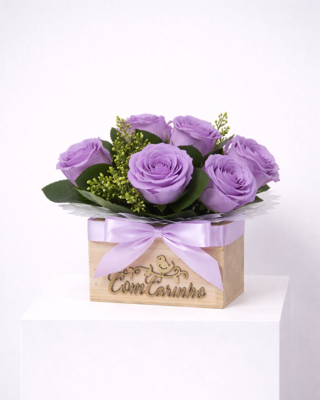 O Encanto Lavanda reúne rosas em tons suaves de lilás, criando uma composição harmoniosa e sofisticada. A tonalidade transmite serenidade, admiração e afeto, tornando este presente perfeito para momentos especiais e gestos cheios de significado.