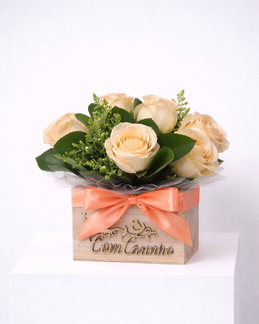 O Encanto Pêssego combina rosas em tonalidade creme com nuances levemente pêssego, criando uma composição elegante e acolhedora. A paleta transmite carinho, gratidão e leveza, sendo perfeita para presentear com bom gosto e sensibilidade.