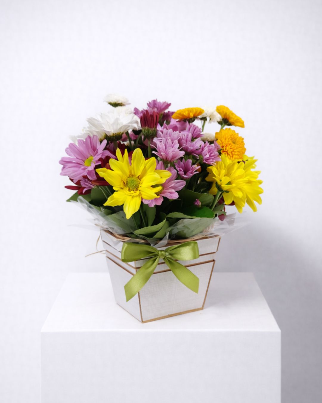 Um arranjo vibrante e cheio de vida, que celebra a alegria nas pequenas coisas. As margaridas coloridas se encontram em perfeita harmonia, transmitindo leveza, energia e um carinho espontâneo. Ideal para iluminar o dia de alguém especial, agradecer com afeto ou simplesmente levar cor para qualquer ambiente.