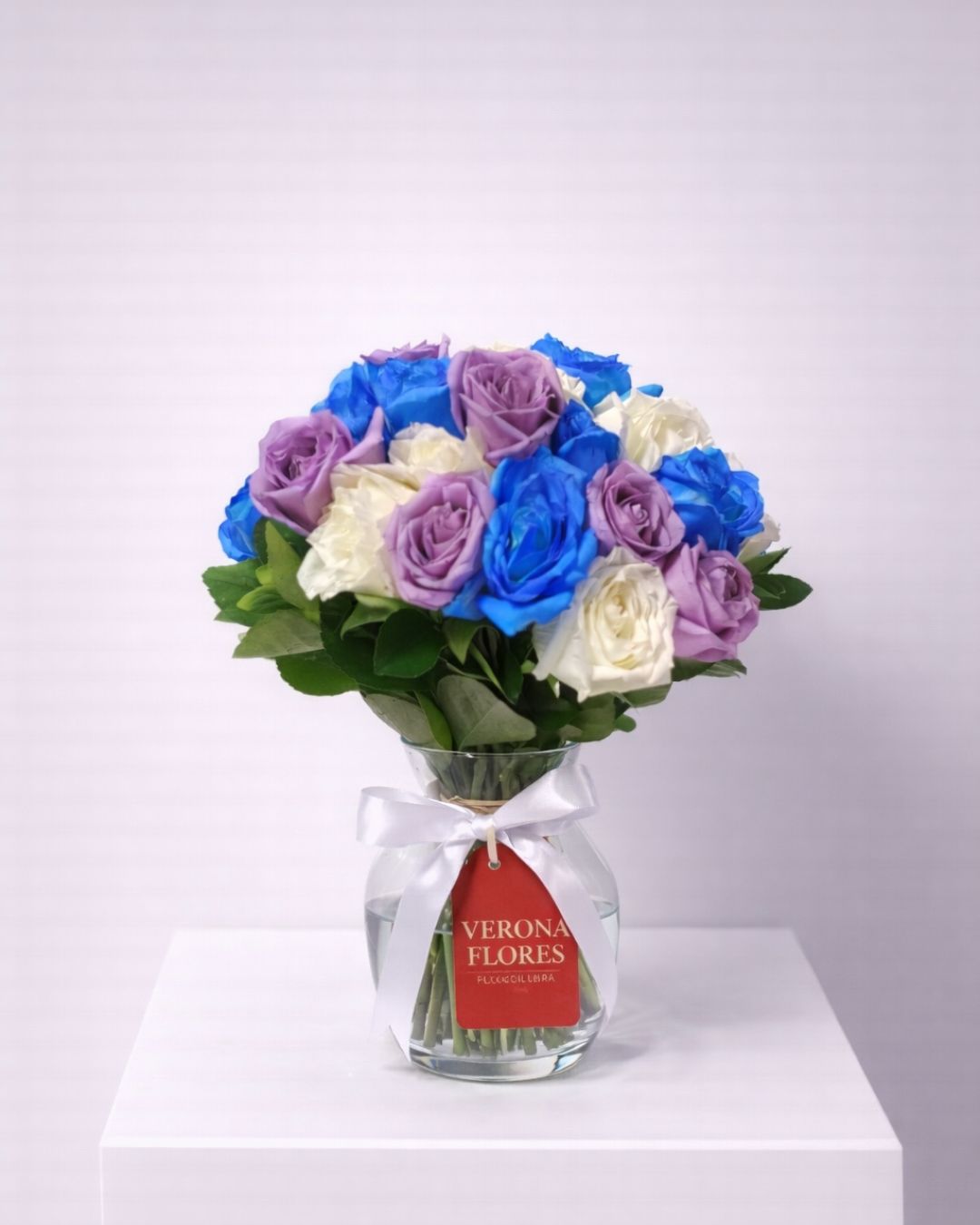 Um arranjo sofisticado e delicado, que combina tons suaves e marcantes em perfeita harmonia. As rosas em azul, lilás e branco criam uma composição elegante e moderna, transmitindo serenidade, equilíbrio e encanto. Ideal para presentear em ocasiões especiais ou decorar ambientes com um toque refinado e contemporâneo.