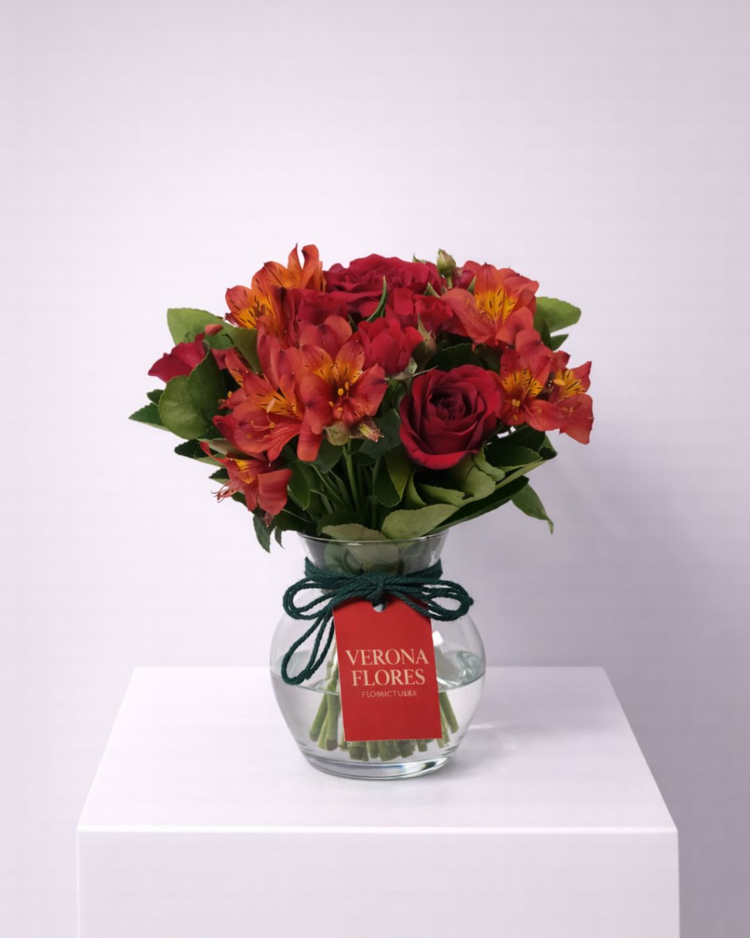 Arranjo elegante e marcante composto por rosas vermelhas e astromélias em tons quentes de vermelho e laranja, combinadas com folhagens verdes e acomodadas em vaso de vidro com acabamento delicado. Um arranjo intenso e cheio de personalidade, ideal para expressar amor, paixão e sentimentos profundos.