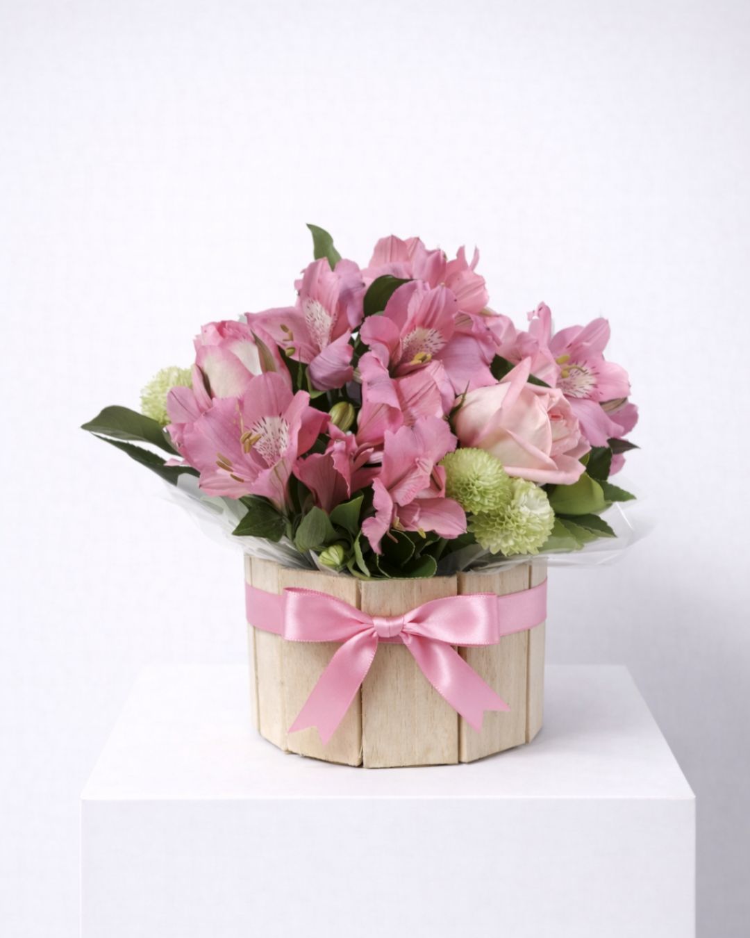 Arranjo delicado e elegante composto por astromélias rosas, rosa clara, flores de complemento verdes e folhagens naturais, acomodado em um charmoso cachepô de madeira rústica. Uma opção perfeita para transmitir carinho, leveza e sofisticação em qualquer ocasião.