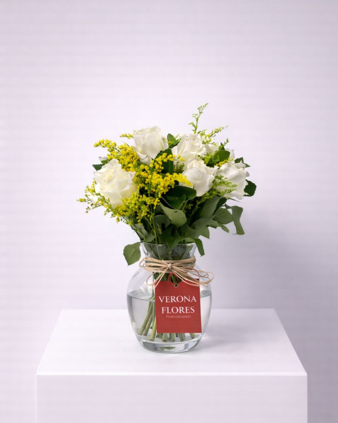 Um arranjo delicado e sofisticado, que transmite paz, elegância e harmonia. As rosas brancas ganham destaque em meio às flores amarelas e folhagens verdes, criando uma composição leve e atemporal, perfeita para presentear ou decorar ambientes com suavidade.