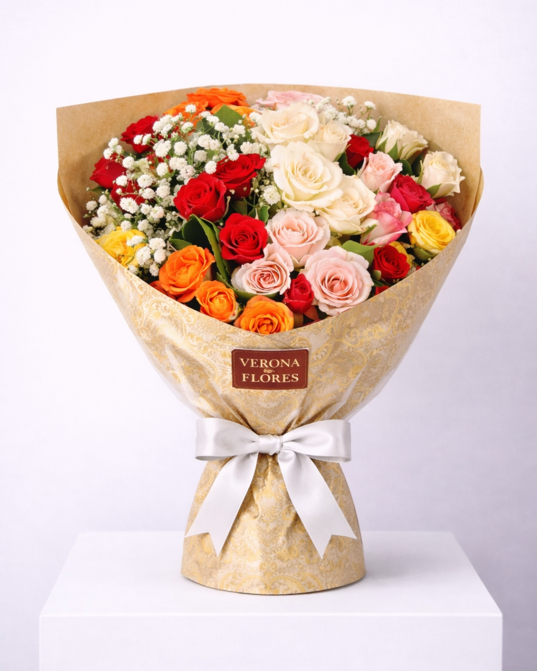 O Celebração em Cores combina rosas em diferentes tonalidades com delicadas flores complementares, criando uma composição rica, leve e visualmente encantadora. É um presente que ilumina o ambiente e surpreende pela harmonia entre cores e texturas.