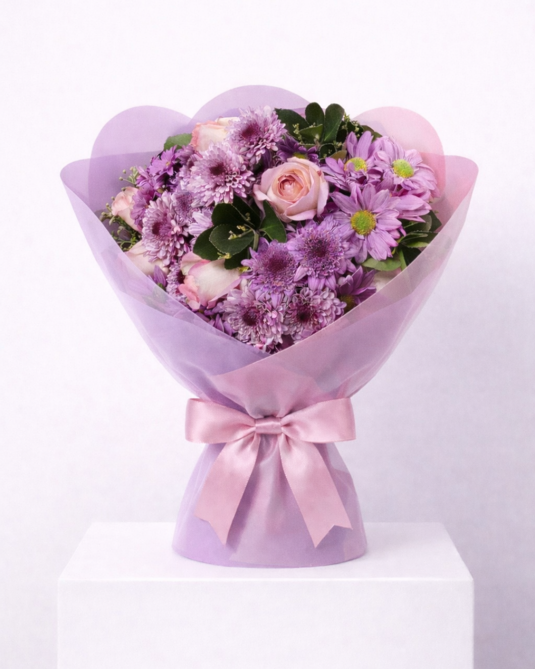 Buquê delicado com 12 rosas em tom rosé, margaridas lilás e roxas e folhagens verdes, embalado em papel decorativo com acabamento sofisticado. Um arranjo suave e encantador, ideal para transmitir carinho, afeto e delicadeza em qualquer ocasião especial.