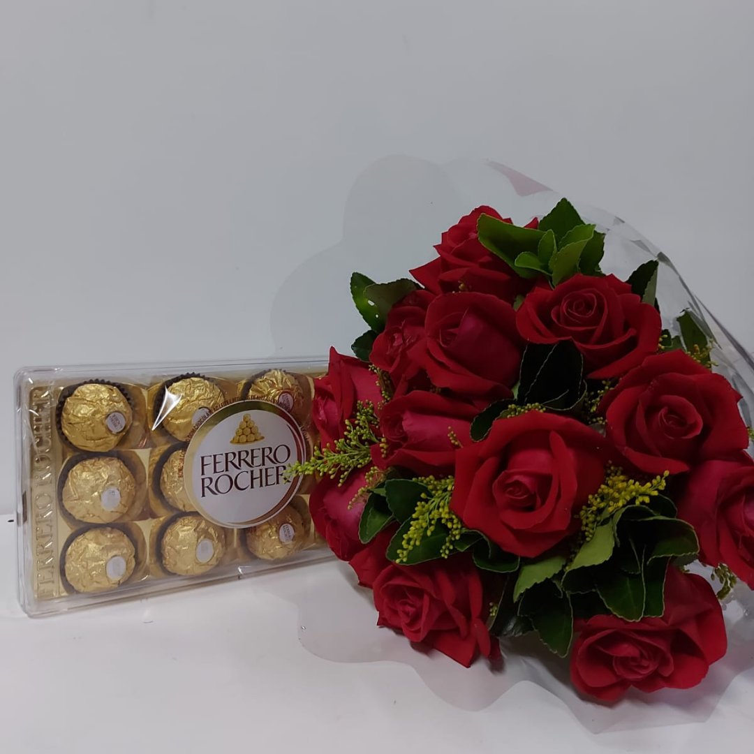 Um buquê elegante de 12 rosas vermelhas, símbolo de amor e intensidade, acompanhado de chocolates Ferrero Rocher que acrescentam um toque de sofisticação e doçura. Uma escolha certeira para surpreender em momentos especiais e demonstrar carinho de forma marcante.