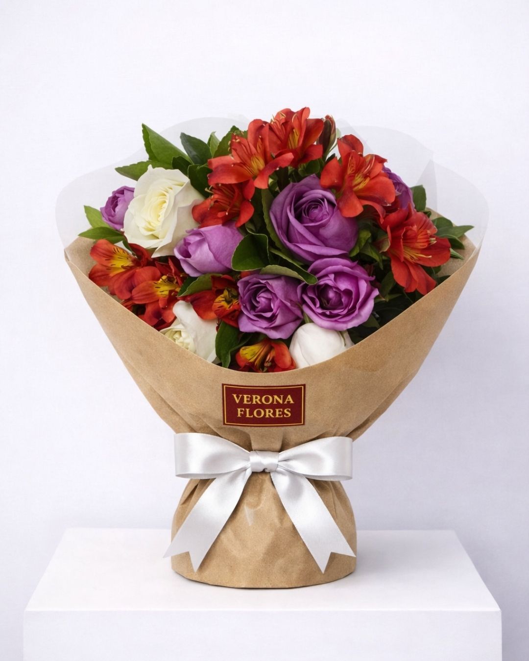 Buquê delicado com 12 rosas em tons de lilás e branco, astromélias em tom coral, folhagens verdes e acabamento em papel decorativo transparente. Um arranjo suave e elegante, ideal para transmitir carinho, afeto e delicadeza em qualquer ocasião especial.