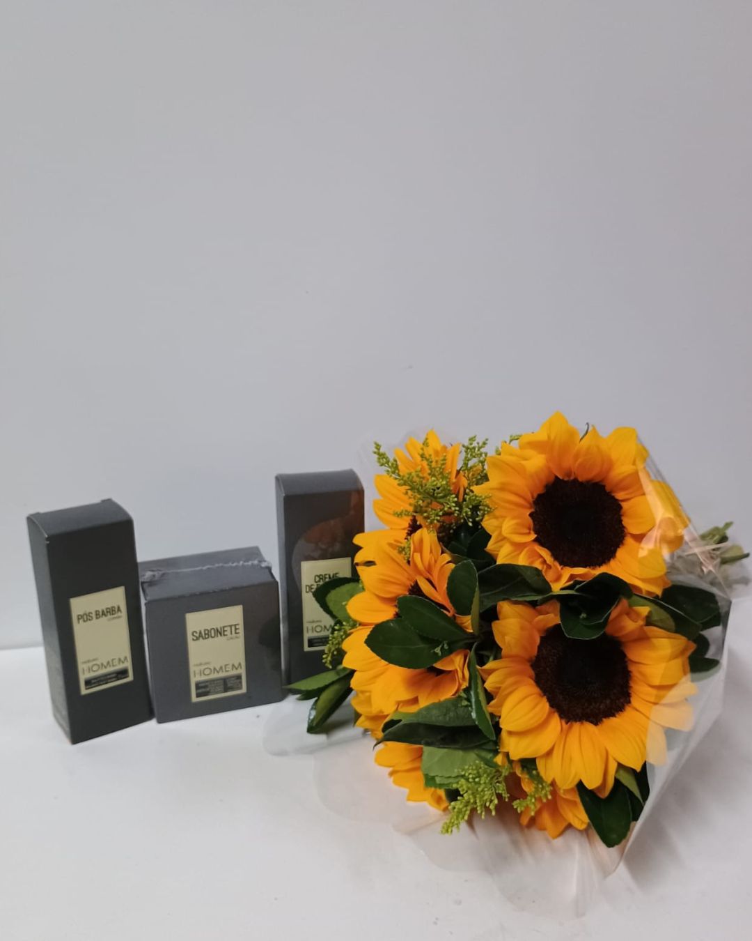 Um combo marcante e sofisticado, que une a energia vibrante dos girassóis com o cuidado masculino da linha Homem. Um presente elegante, ideal para transmitir admiração, respeito e carinho em forma de detalhes.