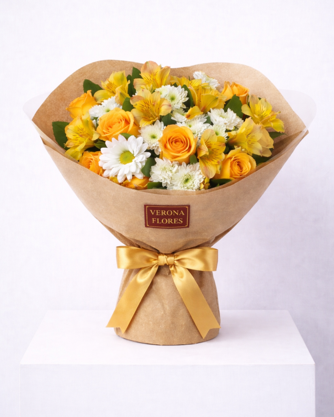 Buquê vibrante com 5 rosas amarelas, margaridas brancas, astromélias em tons amarelos e folhagens, embalado em papel kraft decorativo. Uma combinação alegre e iluminada, perfeita para transmitir energia, carinho e boas vibrações em qualquer ocasião.