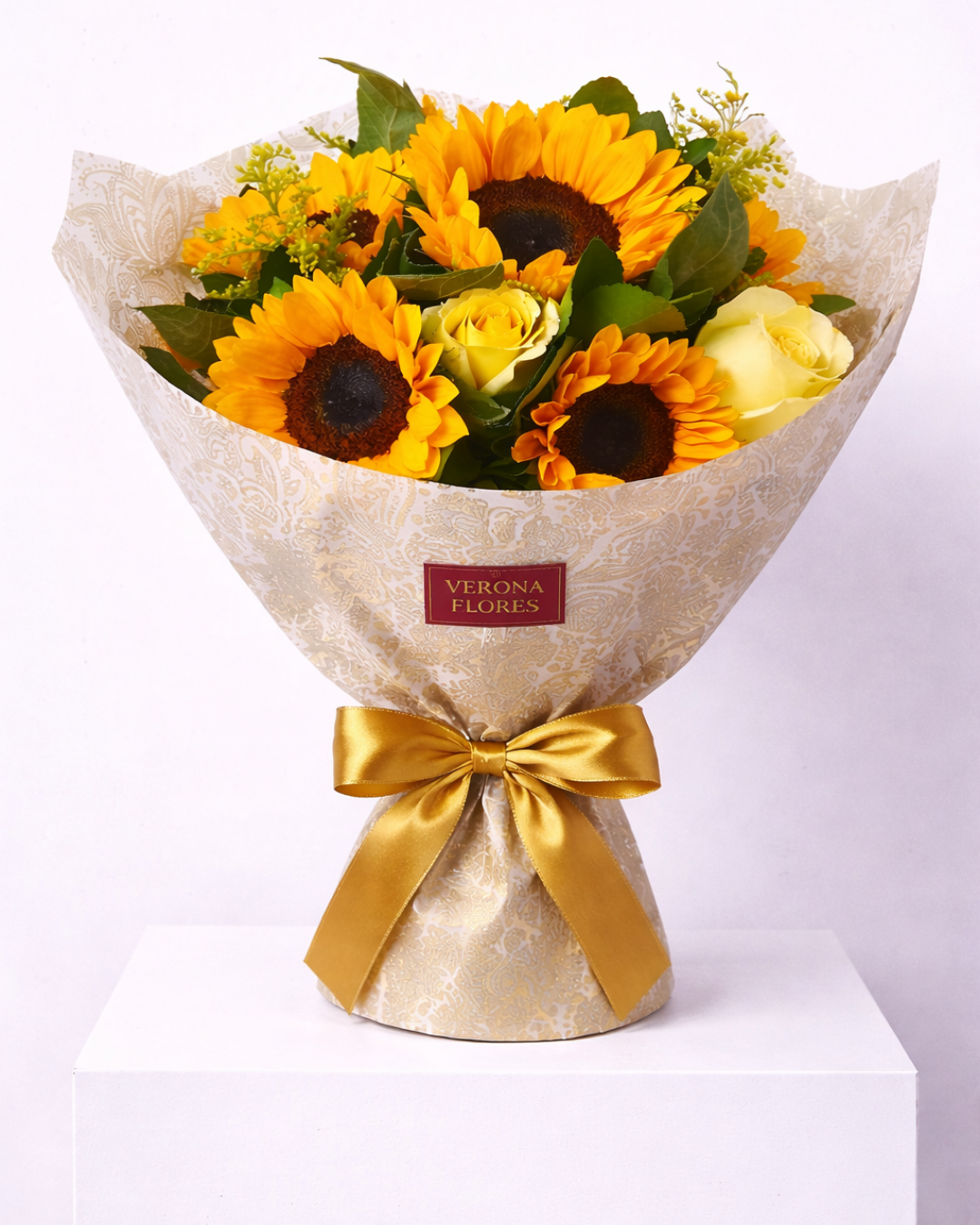 Um buquê vibrante e cheio de energia, composto por girassóis que simbolizam alegria, vitalidade e boas vibrações. A combinação com rosas claras e folhagens traz equilíbrio e sofisticação, tornando este buquê ideal para presentear e iluminar qualquer momento especial.