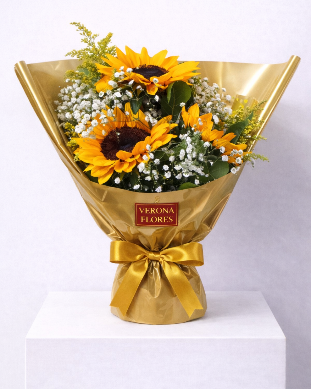 Um buquê vibrante e cheio de energia, que combina a alegria dos girassóis com a delicadeza das flores brancas, envolto em uma embalagem dourada sofisticada. Ideal para transmitir felicidade, gratidão e bons sentimentos, iluminando qualquer ocasião especial.