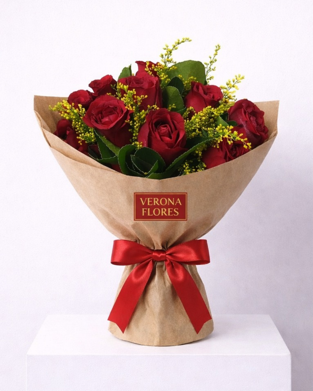 Buquê clássico com 12 rosas vermelhas, flores complementares brancas e folhagens verdes, embalado em papel decorativo transparente. Um arranjo elegante e intenso, ideal para expressar amor, paixão e sentimentos profundos em ocasiões especiais.