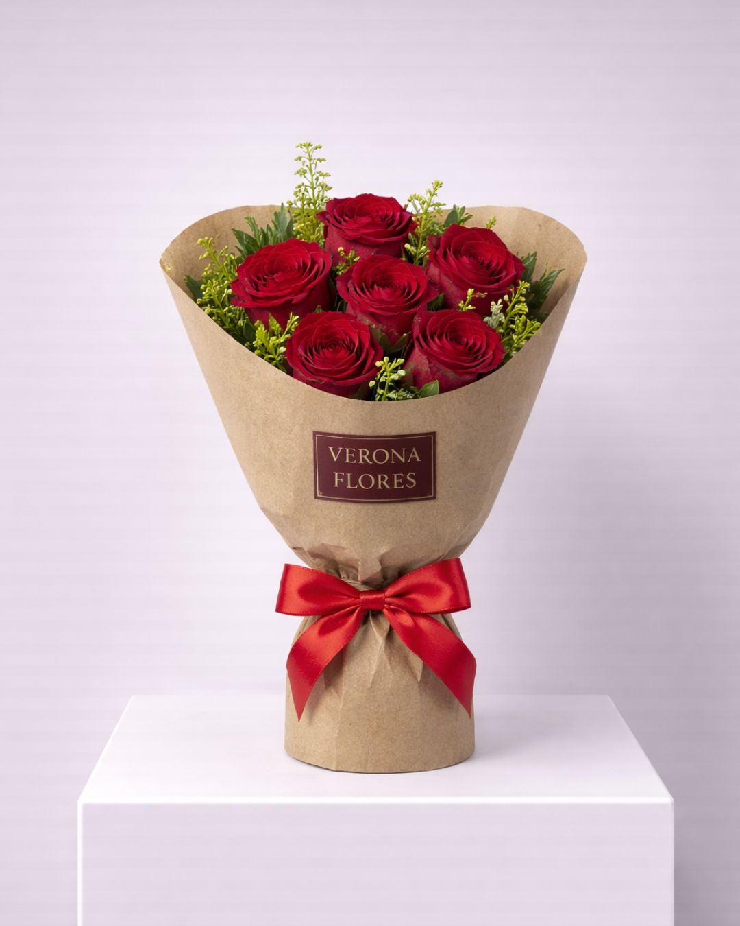 Buquê clássico com 6 rosas vermelhas, tango e folhagens verdes, embalado em papel decorativo transparente. Um arranjo elegante e intenso, ideal para expressar amor, paixão e sentimentos profundos em ocasiões especiais.