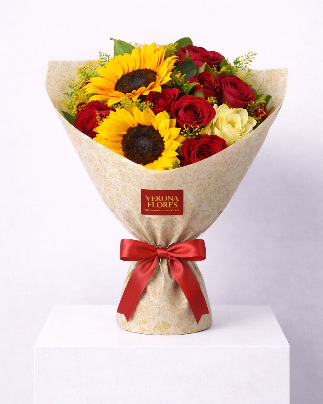 Um buquê marcante e cheio de personalidade, que une a energia vibrante dos girassóis com a intensidade romântica das rosas vermelhas. A combinação transmite amor, admiração e alegria, envolvida em uma embalagem elegante que valoriza ainda mais a composição. Ideal para surpreender com emoção e sofisticação.