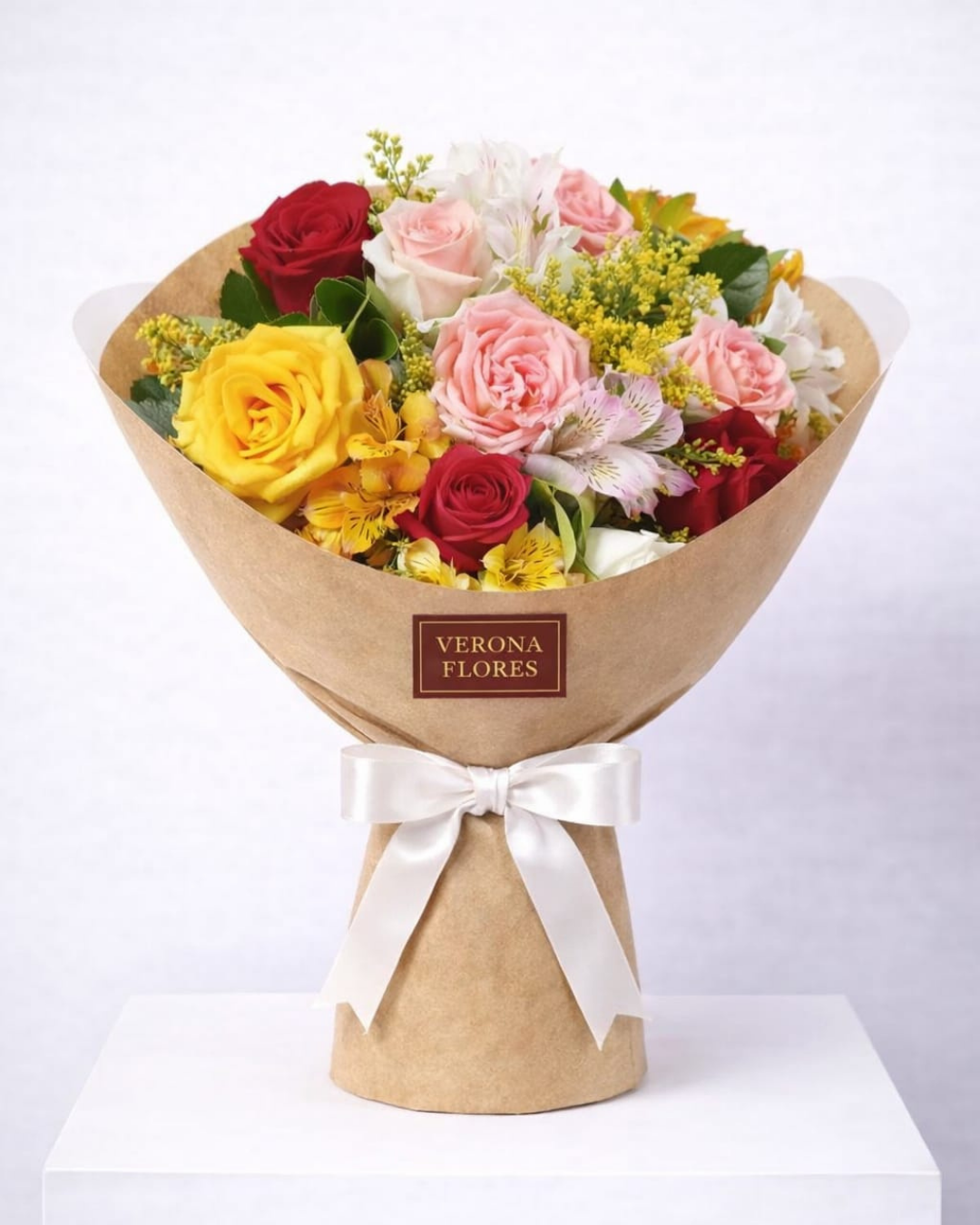 Buquê vibrante com 12 rosas em tons de rosa, branco, amarelo e vermelho, astromélias e flores do campo em tons laranjas e amarelos, além de folhagens verdes, embalado em papel decorativo transparente. Um arranjo alegre e cheio de vida, ideal para celebrar, presentear e transmitir boas energias em qualquer ocasião.