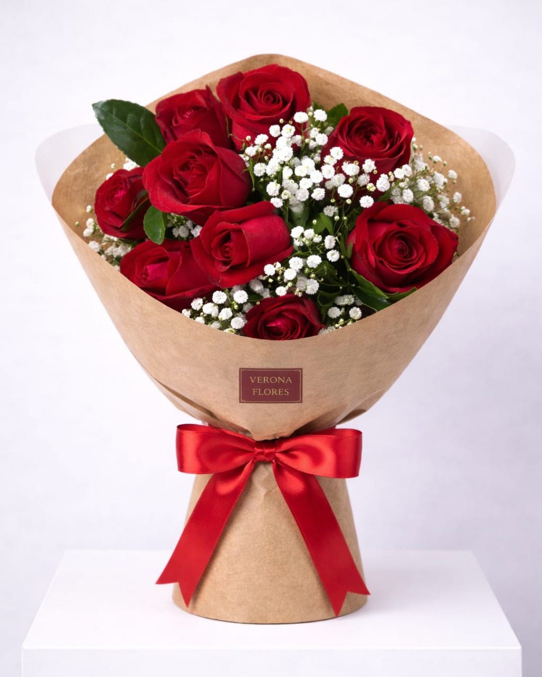 Este buquê reúne rosas vermelhas selecionadas, delicadamente harmonizadas com gypsophila (mosquitinho) e folhagens verdes, envoltas em embalagem kraft sofisticada.