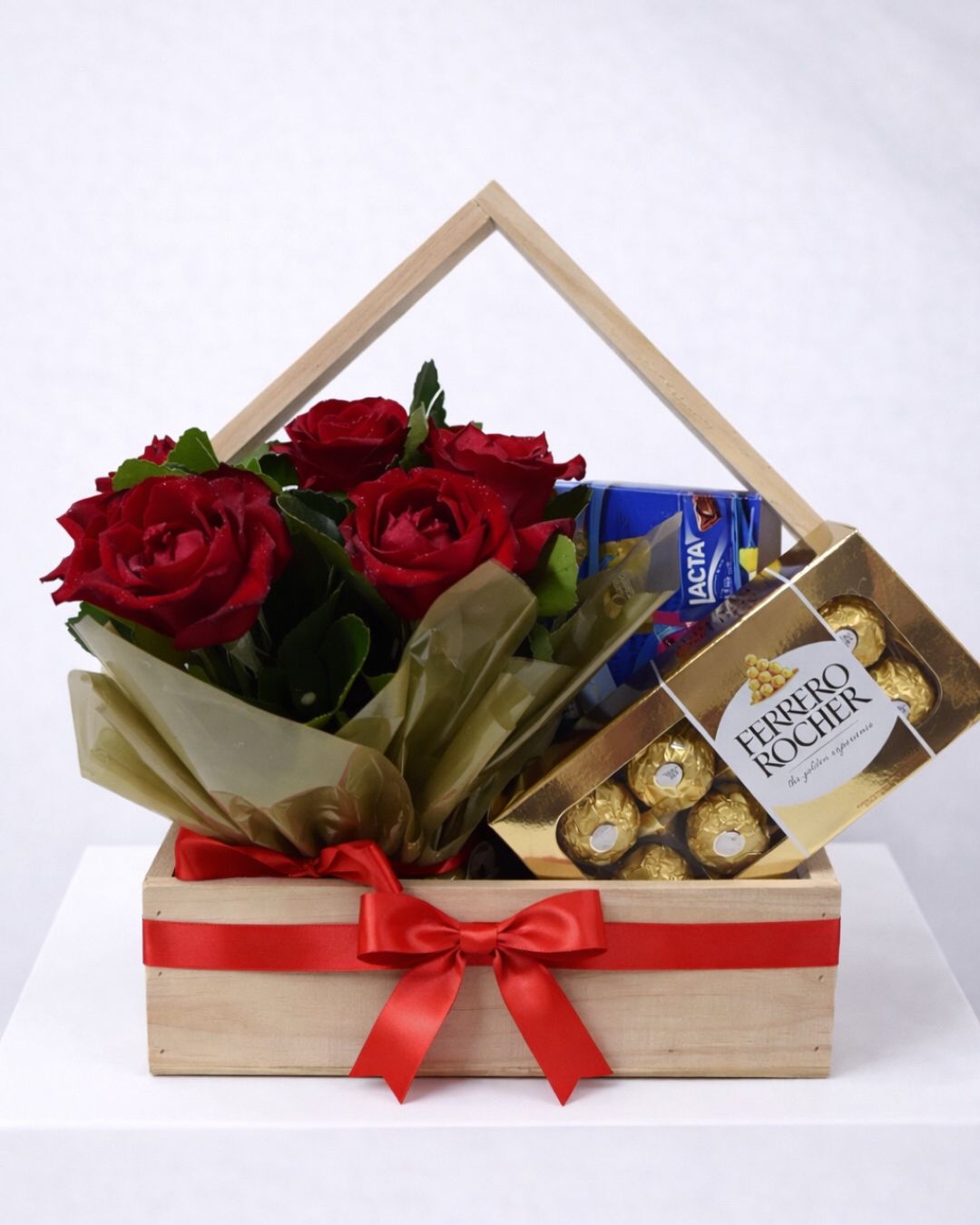 A Cesta Amor & Carinho combina rosas vermelhas intensas com chocolates finos em uma estrutura moderna em formato de casinha, trazendo aconchego e sofisticação ao presente. Ideal para declarações especiais, aniversários de namoro e momentos marcantes.