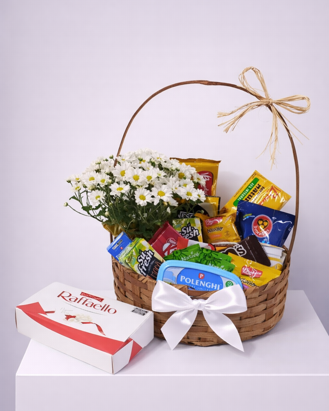 Uma cesta que une delicadeza, frescor e carinho em cada detalhe. As flores brancas trazem leveza e serenidade, enquanto a seleção de itens para café da manhã cria uma experiência acolhedora e saborosa. Ideal para começar o dia com calma, amor e atenção aos pequenos prazeres.