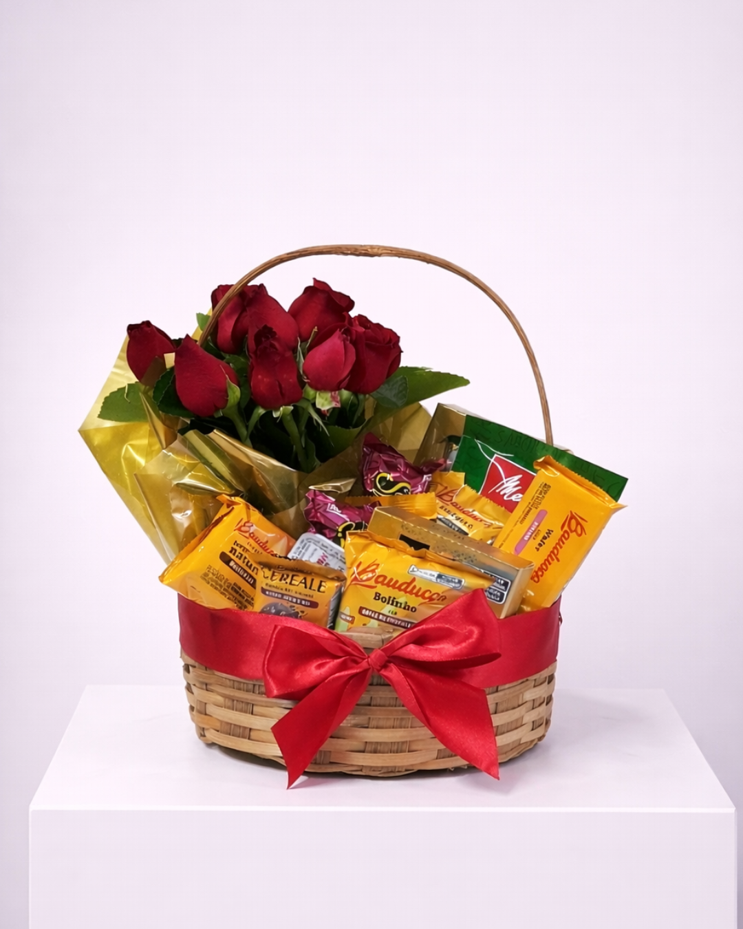 Uma cesta elegante que une o romantismo das rosas vermelhas com sabores cuidadosamente selecionados para um café da manhã cheio de afeto. Ideal para surpreender quem se ama logo nas primeiras horas do dia, transformando o momento em uma experiência delicada e memorável.
