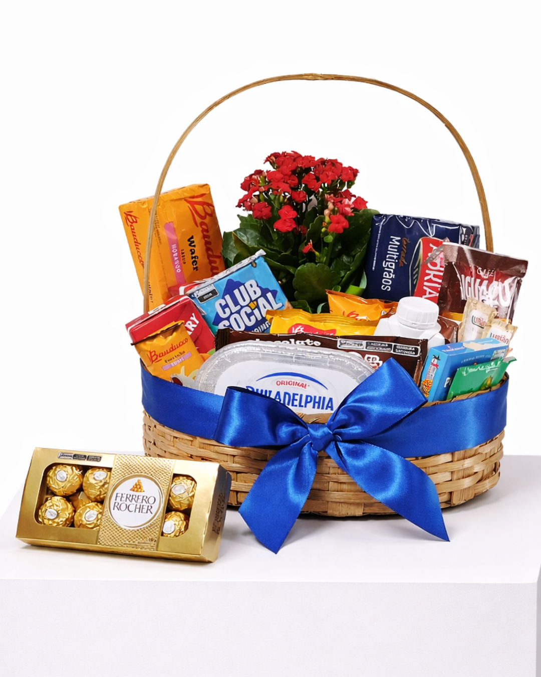Uma cesta pensada para impressionar desde o primeiro olhar. A combinação de tons azuis, flores naturais e itens selecionados transforma o café da manhã em um gesto refinado, marcante e cheio de carinho.