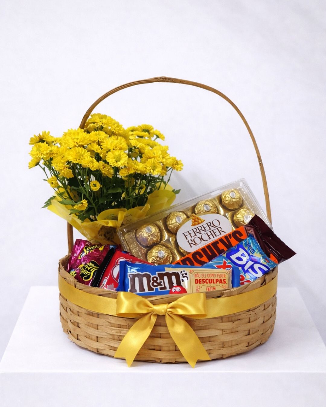 A Cesta Doce Luz une flores amarelas cheias de vida com chocolates clássicos e sofisticados, criando um presente alegre, elegante e versátil. Ideal para aniversários, agradecimentos, pedidos de desculpa ou para iluminar o dia de alguém especial.