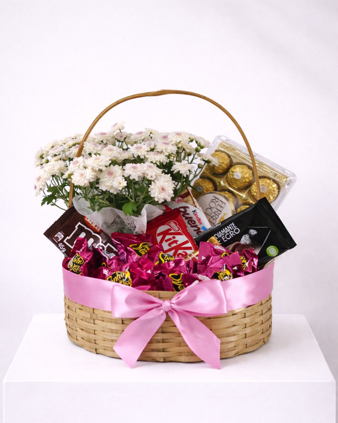 A Cesta Encanto Rosé combina flores em tons suaves com uma seleção generosa de chocolates clássicos, criando um presente elegante e cheio de personalidade. O laço rosa traz leveza e romantismo, tornando essa composição ideal para aniversários, agradecimentos, Dia das Mães ou momentos especiais.