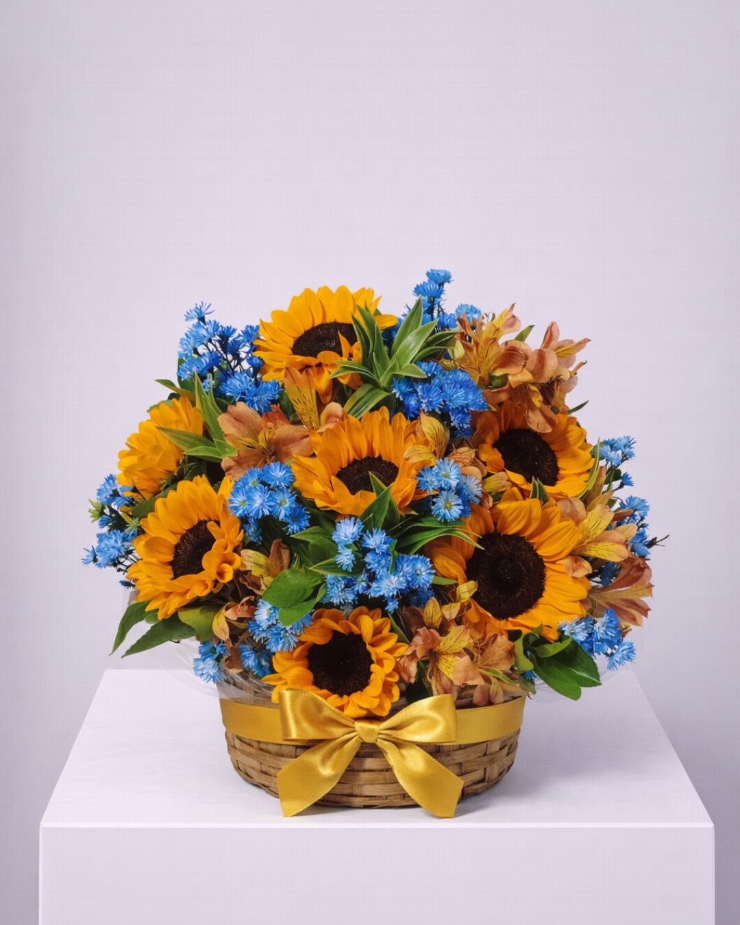 A Cesta Girassol Energia Viva combina a força dos girassóis com flores complementares em tons quentes e detalhes em azul, criando um contraste moderno e sofisticado. O resultado é um arranjo impactante, alegre e cheio de vida.