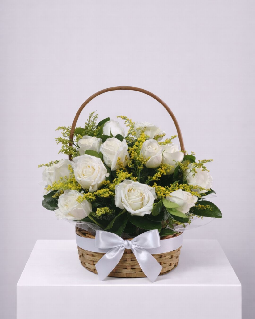 A Cesta Rosas Brancas Clássica traz a pureza das rosas brancas combinadas com folhagens verdes e detalhes em amarelo suave, criando uma composição elegante e harmoniosa. Ideal para transmitir carinho, respeito e admiração com discrição e bom gosto.