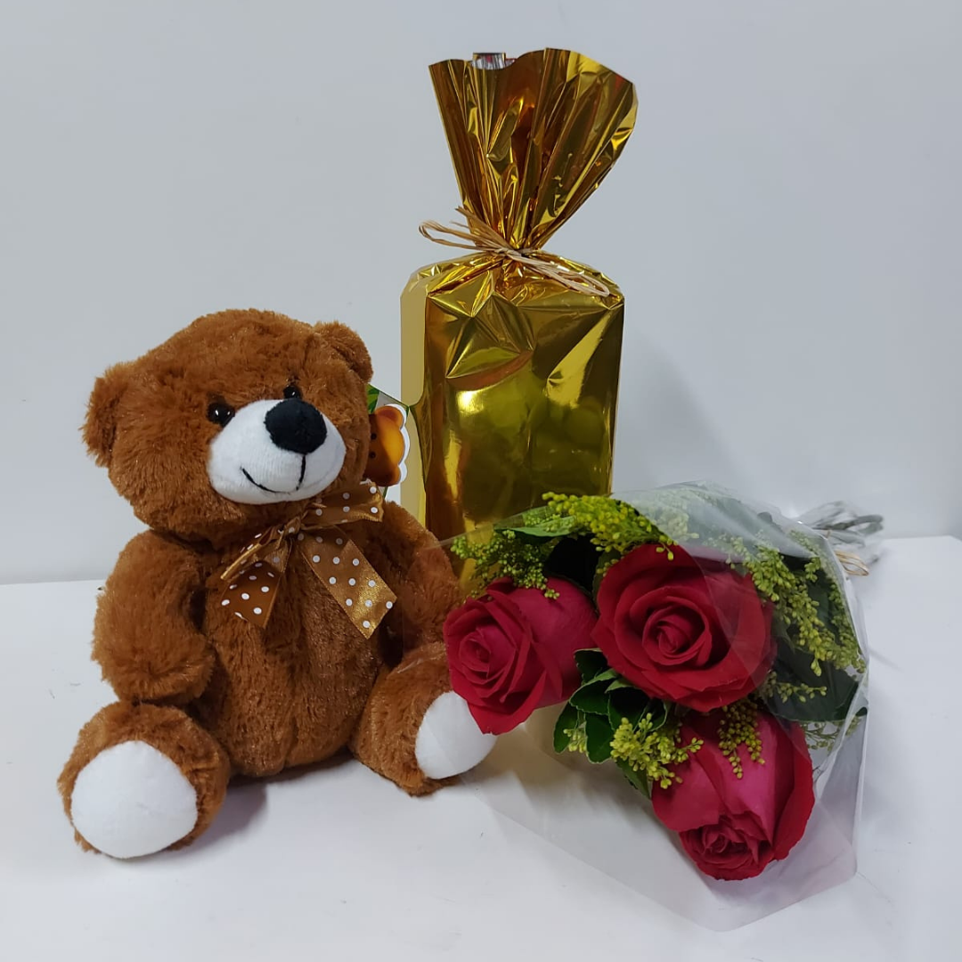 Um presente encantador que combina carinho, elegância e afeto. Este combo traz um ursinho de pelúcia macio, um delicado buquê de rosas vermelhas e uma caixa de bombons para presente envolto em embalagem dourada, criando uma experiência especial e cheia de significado. Ideal para surpreender em datas românticas, aniversários ou para demonstrar amor de forma inesquecível.