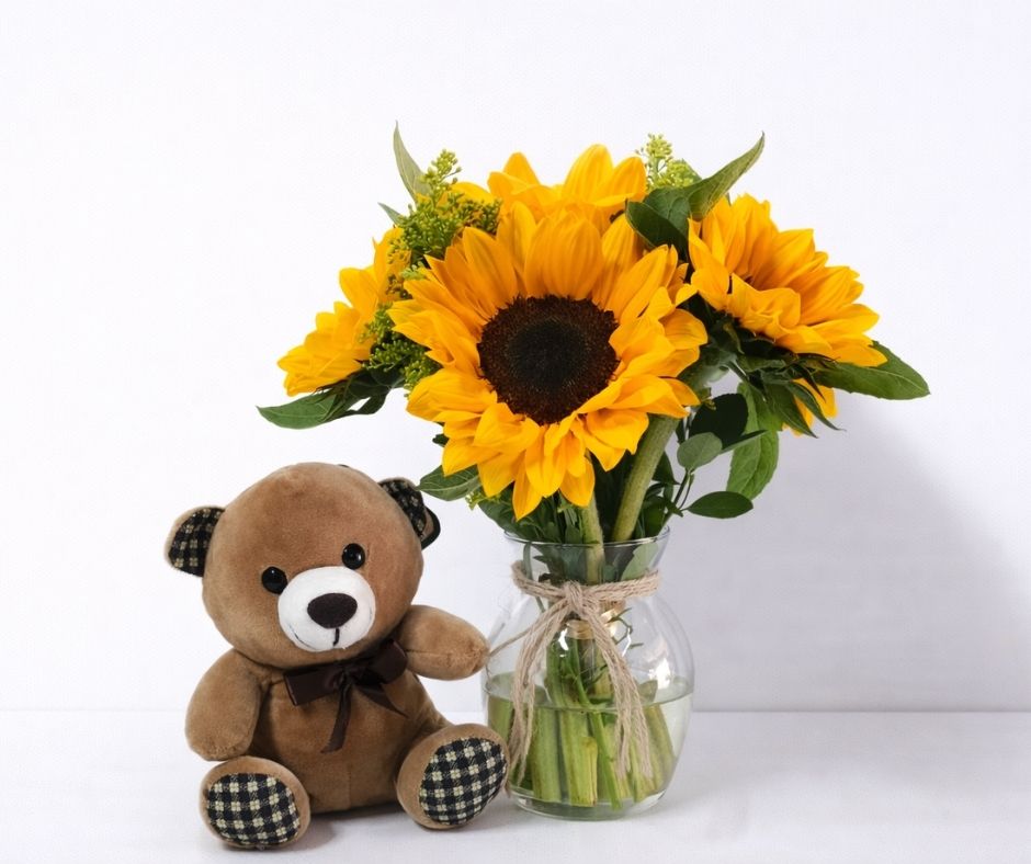 Um combo romântico e sofisticado para surpreender com leveza: girassóis vibrantes em vaso de vidro, acompanhados de uma pelúcia fofa que deixa o presente ainda mais especial. Ideal para aniversários, agradecimentos e para dizer “pensei em você” de um jeito marcante.