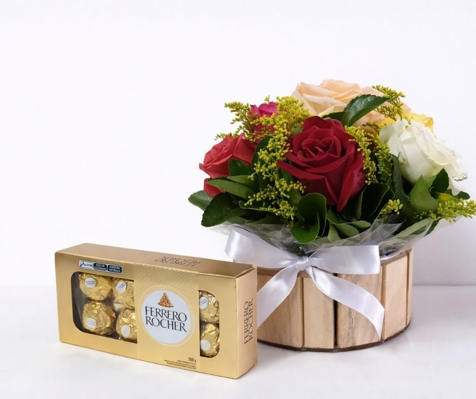 Um combo elegante que combina a delicadeza das rosas em tons variados com a sofisticação dos chocolates Ferrero Rocher. Uma escolha clássica e refinada para presentear em ocasiões especiais, transmitindo carinho e bom gosto.