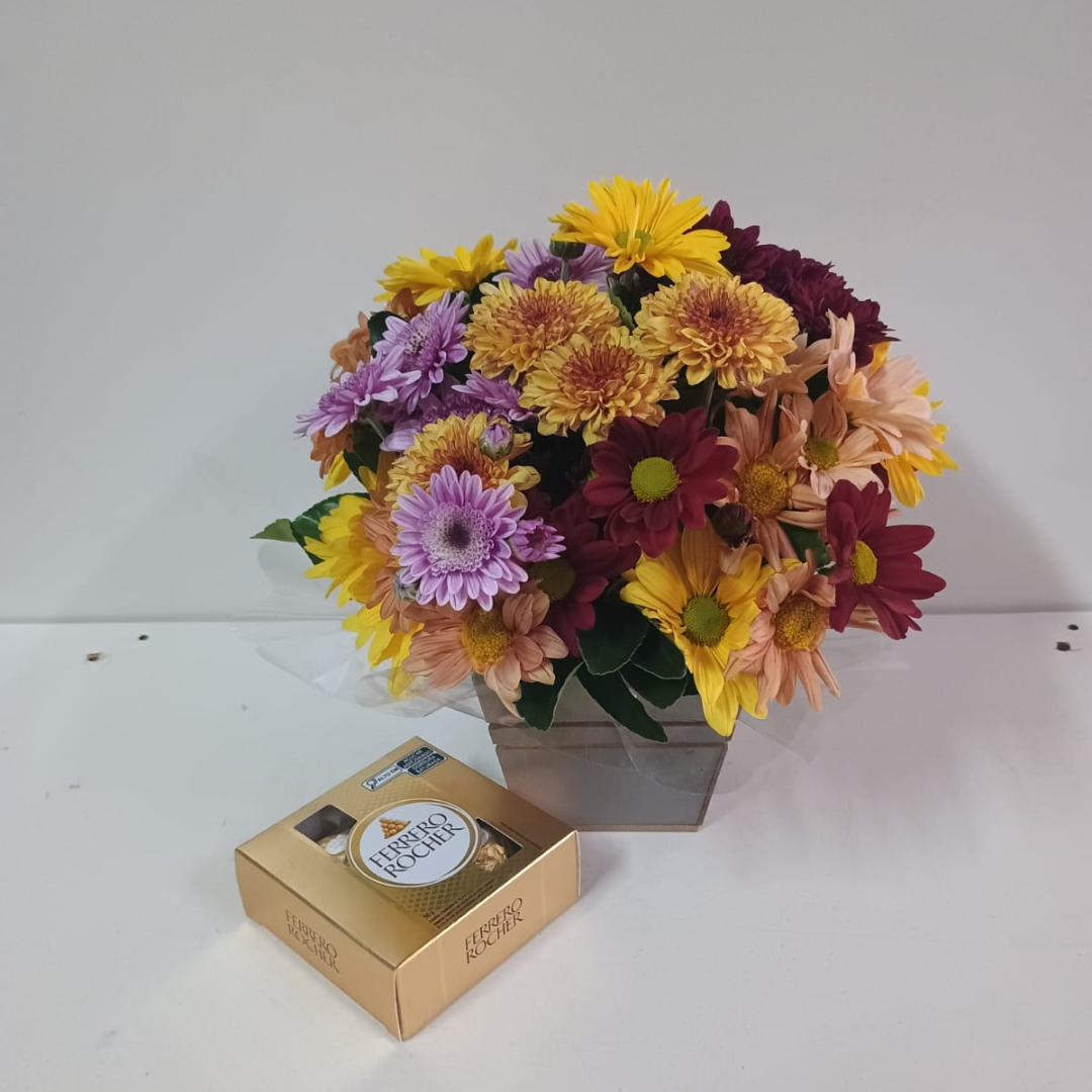Um presente alegre e elegante, que combina a delicadeza das flores em tons quentes e vibrantes com a sofisticação do chocolate Ferrero Rocher. Ideal para celebrar momentos especiais com leveza, carinho e bom gosto.