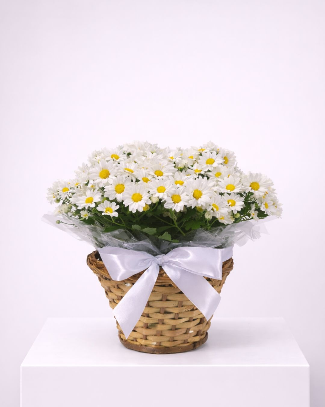 Montadas em um cachepô de fibra natural e finalizadas com um laço branco acetinado, as margaridas trazem frescor e suavidade ao ambiente, sendo perfeitas para presentear com carinho ou decorar com charme e aconchego.