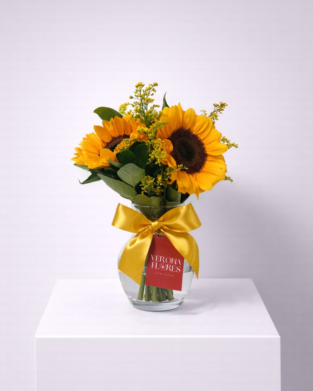 Arranjo alegre e marcante composto por girassóis frescos, combinados com delicados tangos e folhagens verdes, acomodados em vaso de vidro com laço decorativo. Uma composição vibrante que transmite energia, felicidade e boas vibrações, perfeita para iluminar qualquer ambiente.